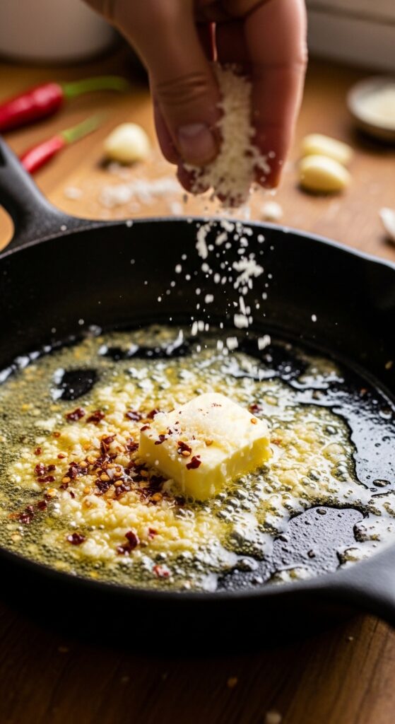 - Butter + Garlic magic: Melt 4 tablespoons of butter in a large skillet over medium heat. Toss in minced garlic and red pepper flakes. Sauté until fragrant (about 1–2 minutes). Be careful not to burn it!