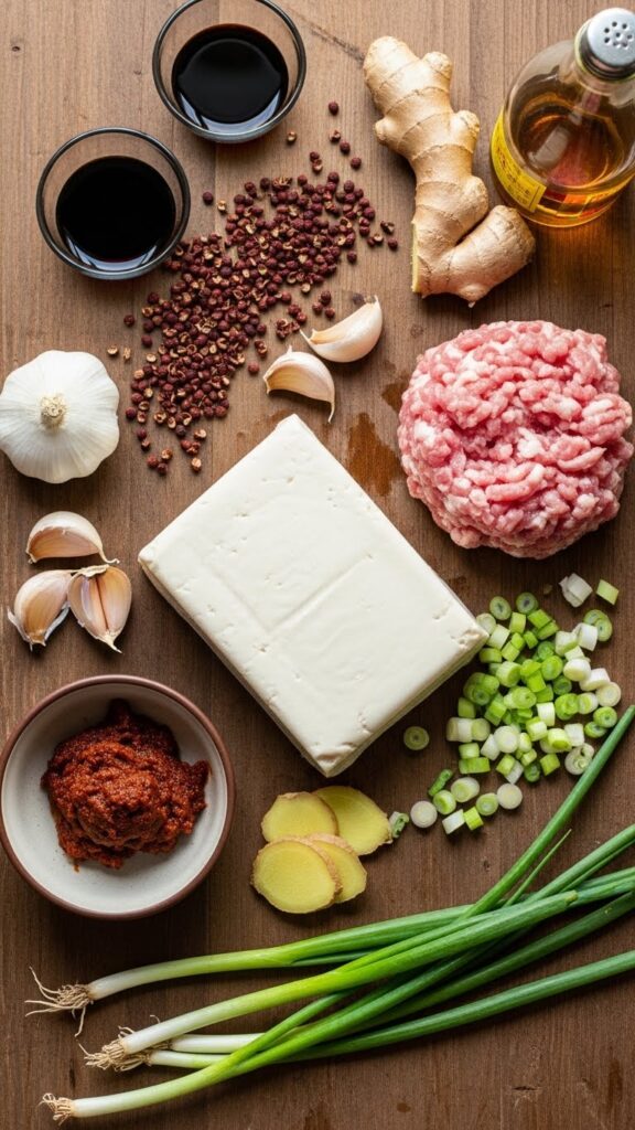 Chop garlic, ginger, and green onions. Keep them separate so you can add at the right stages timing matters in mapo tofu, otherwise the flavors don’t pop.