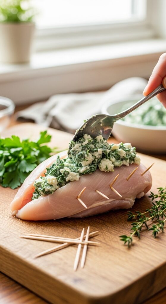 Pro tip: Don’t overstuff. Your chicken should hold the filling without bulging like a stuffed balloon trust me, you’ll thank me later when everything cooks evenly.