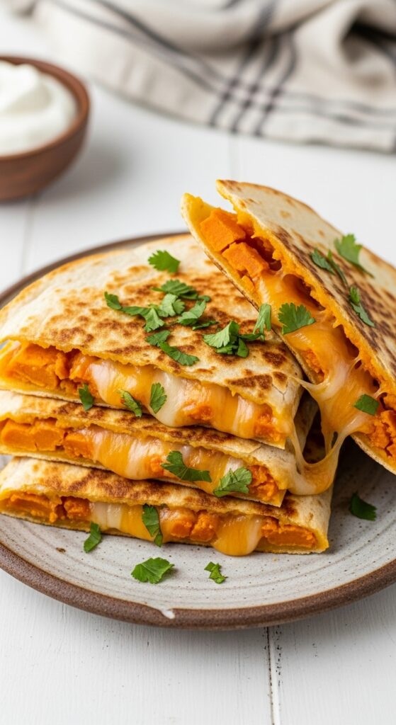 - Spread sweet potato and cheese on a tortilla, top with another.