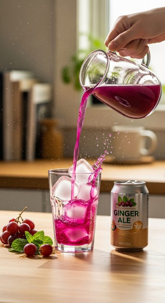 Let’s slow down for a second, because the taste deserves attention. The first sip usually hits with cool, fruity sweetness from the grape juice. Right behind that, the ginger ale slides in with gentle spice and bubbles.